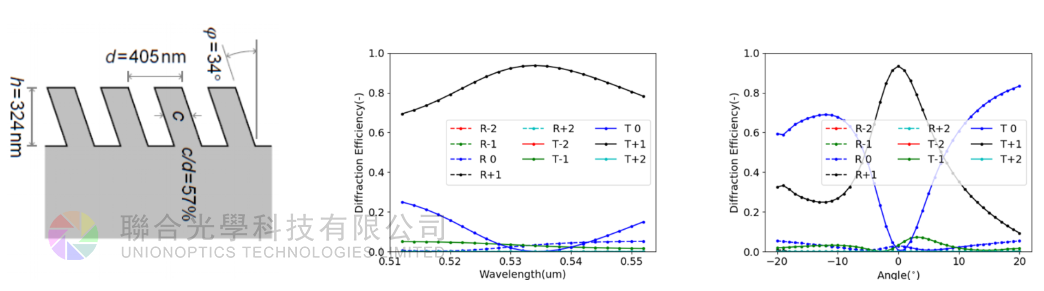 Slanted and blazed gratings are an interesting structure for coupling light into waveguides for head mounted displays for instance in virtual and augmented reality (VR & AR) headsets. The calculations above were executed within 5 minutes on a standard laptop.