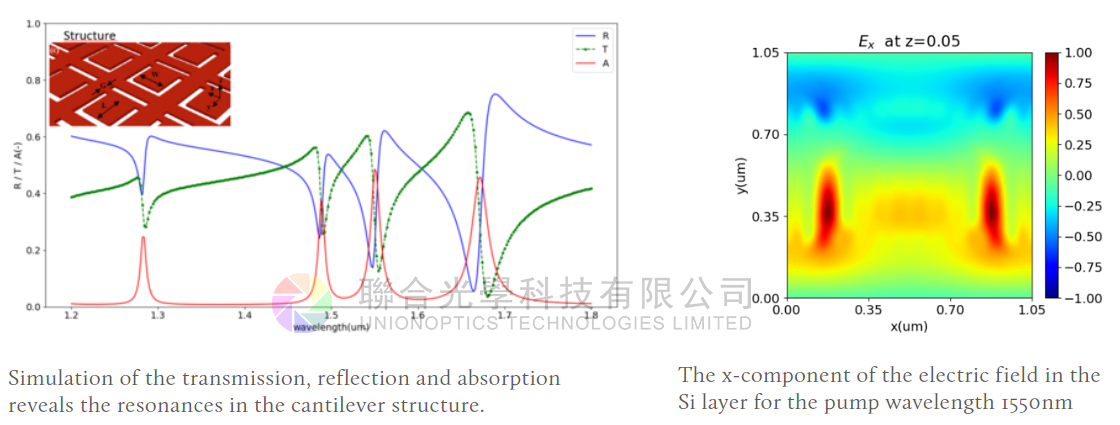 In the example below the reflection and transmission of the Si cantilever structure in the insert is simulated. Karvounis et. al. used this structure to engineer a strong optomechanical response from a flaoting Si layer. By pumping the structure with a modulated beam at 1550nm the cantilever structure can be made to tilt up to 10 degrees. This can be sensed by a probe beam at 1310nm. The forces acting on the cantilever can be calculated from the electric field components.