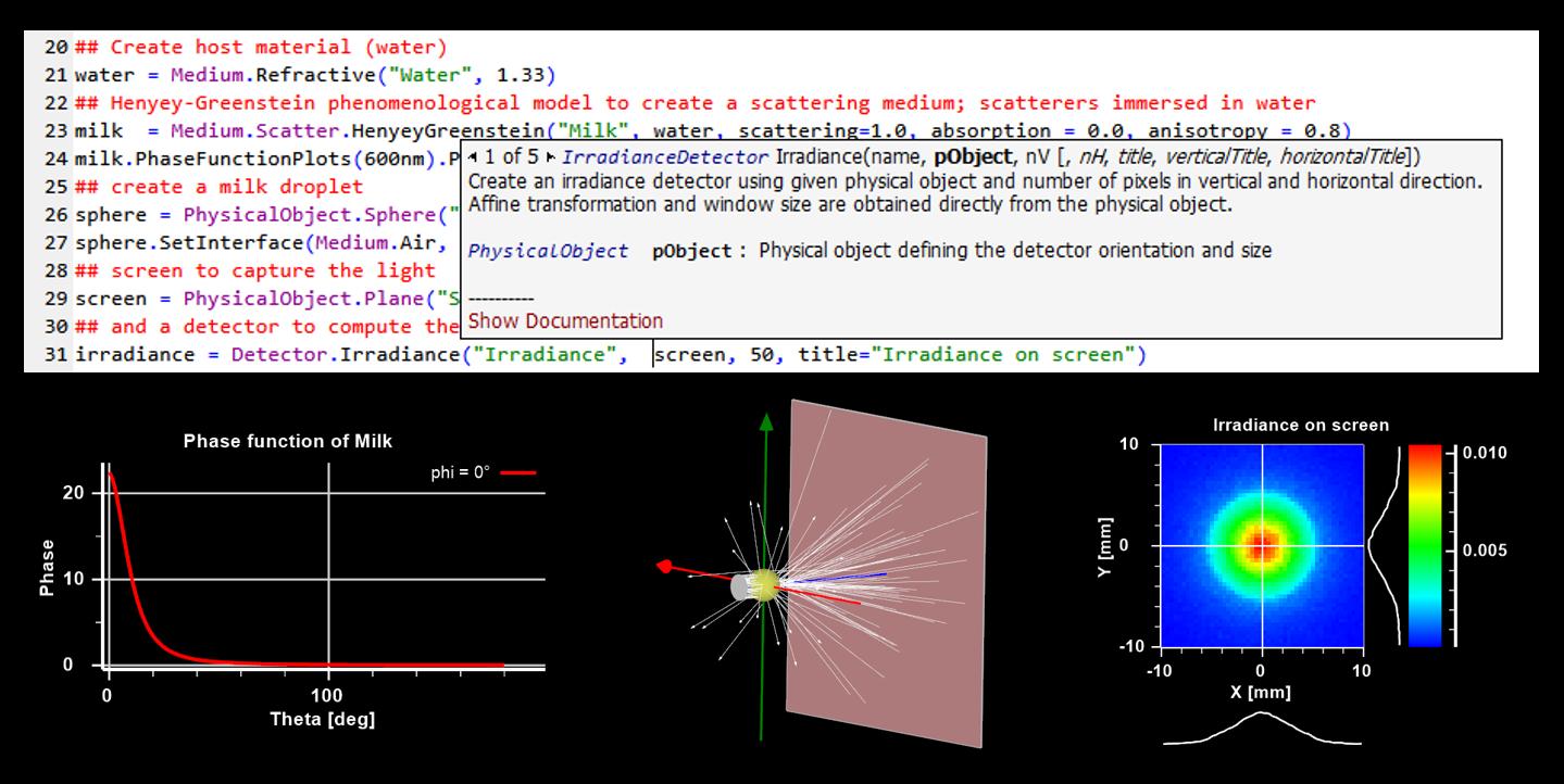 RayJack ONE uses Python, the most popular scripting language in science and engineering, to efficiently set up optical simulation models. Arrangement and manipulation of physical entities such as surfaces, media, coatings, and light sources are handled within the paradigm of object-oriented programming. Users are guided in their workflow by the script editor’s auto-completion feature, which suggests context-sensitive commands and parameters. Syntax highlighting ensures the code’s clarity at first glance. Besides this top-level approach, the user also has direct and extensive deep-level access to RayJack ONE’s simulation kernel with all relevant system parameters and built-in tools in order to provide complete control over the simulation and assist in automation.