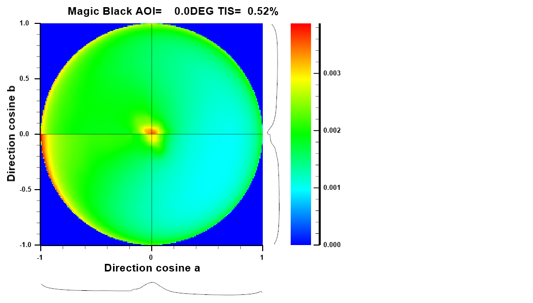 The example shows a pseudo-color plot of the BRDF of #MagicBlack for varying angles of incidence. Magic Black is a high-performance black coating optimized for the visible spectrum made Acktar (ACM Coatings GmbH (subsidiary of Acktar Ltd.)
