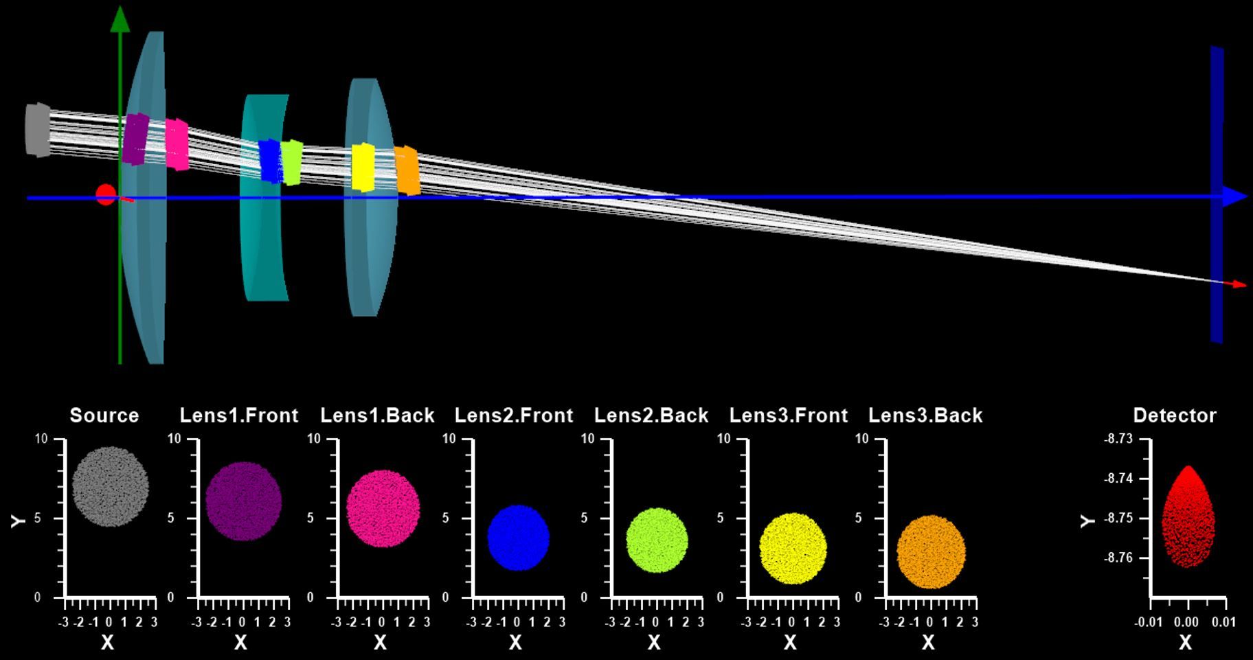 The figure below exemplifies transient detectors in the case of a simple Cooke triplet.